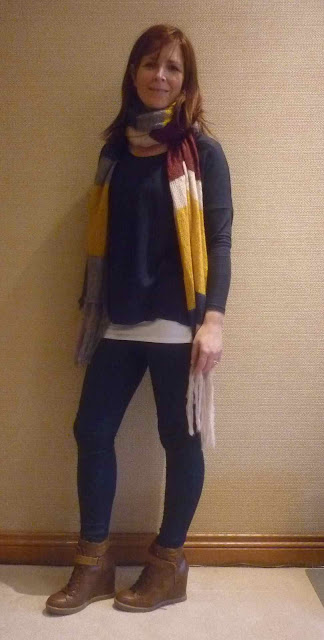 | Scarf - Matalan £8 Navy Boxy Jersey Top - Dorothy Perkins (similar here) Jeggings - Warehouse Wedge Trainers - Matalan £22 |