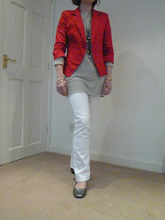 Claire sent me some pictures today of her new red blazer. Now, she had emailed me a week or so ago, telling me she was buying one and while I liked what I saw on the link, I thought it might not be as versatile as navy or stone...but Claire has proven me wrong with four gorgeous style-ups of her new jacket...