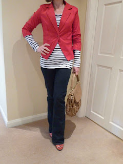 Claire sent me some pictures today of her new red blazer. Now, she had emailed me a week or so ago, telling me she was buying one and while I liked what I saw on the link, I thought it might not be as versatile as navy or stone...but Claire has proven me wrong with four gorgeous style-ups of her new jacket...