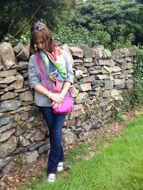 I wore the scarf with H&M Bootcut Jeans, a Room 31 Grey swing jacket (both last seen here), Kurt Geiger cross body bag (last seen here) & my grey converse copies (seen here).Doesn't it brighten up the grey and denim well? I'm going to wear this scarf so much - am looking forward to mixing it with bright green or yellow tops, which normally wouldn't really suit me but the grey in the scarf will tone down the brights and make them more wearable.
