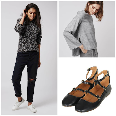 Fluffy Leopard Print Sweatshirt - £15, Textured Side Split Top - £20, Fleur Three Strap Round Toe Shoe - £15